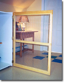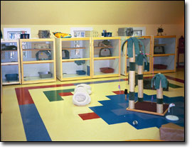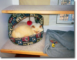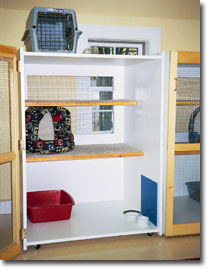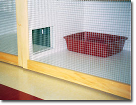![]() The Kennels![]() Cozy and ComfortableEach cat has it's own individual kennel. The sides, top, and bottom, are solid panels, creating a very private and secure feeling. We provide a padded, fleece bed and soft carpeted shelves for comfort. Most of the kennels have window views from the inside. ![]() Sparkling CleanWe work hard to maintain a facility that is always immaculately clean and fresh smelling. The kennels were custom designed for easy cleaning. Before your cat arrives, the bed, carpets, and the entire inside of the kennel are all thoroughly cleaned with a disinfectant and deodorizer. Every morning we change the litter in each litter box to prevent odor build up. The lower level is swept clean and thoroughly disinfected. The facility is fully air-conditioned to control heat and humidity. ![]() Views from Inside the KennelsMost of the kennels are placed in front of windows. From the shelves the cats can look directly outside. Cats spend hours watching birds, squirrels, and all that nature has to offer. ![]() Ventilation and VisibilityThe front of each kennel is a full-length door made with heavy wire screening. This allows for great ventilation and visibility. The top half of the back of each kennel also has the same ½" x ½" hardware cloth screening. Through their screen door cats have full visibility of the kennel. They can see other cats and watch a cat that is out for playtime and exercise. There are twelve operable windows that provide fresh, natural ventilation and a 30" whole house fan that adds forced ventilation when needed in wintertime. ![]() Sharing Two KennelsTwo kennels can combine allowing cats from the same family to share the adjoining spaces. Shown here is an 11" x 11" square opening that enables cats to "pass thru" and visit as they please. It is ideal for three cats, or two cats that may or may not always get along. ![]() Privacy Helps Cats RelaxThe walls of the individual kennels are solid so cats do not see their neighbors. This helps the cats to relax and feel comfortable when they are inside their own kennel. Here is a group of two cat kennels 3' wide, 3' deep, and 4' tall. We also have some upper level, one cat kennels that are 3' tall. |